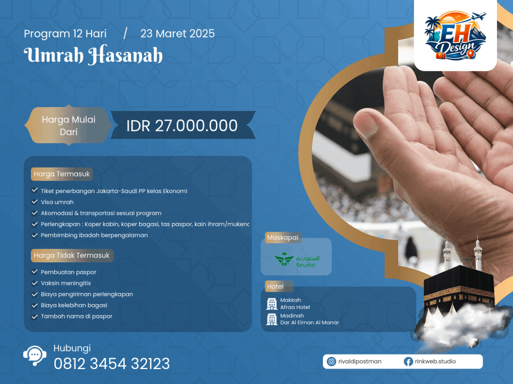 - Perlengkapan : Koper kabin, koper bagasi, tas paspor, kain ihram/mukena, sandal, buku manasik, kain seragam, syal, & sabuk